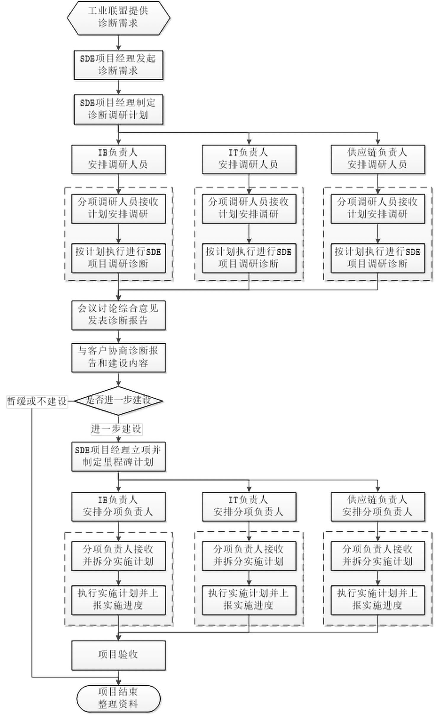 ? SDE項目診斷是由工業(yè)聯(lián)盟提供相應需求,SDE項目經(jīng)理發(fā)起診斷需求,制定診斷計劃,各部門參與診斷工作,進行客戶現(xiàn)場調(diào)研,最終形成診斷報告,并在客戶現(xiàn)場進行報告的發(fā)布;
