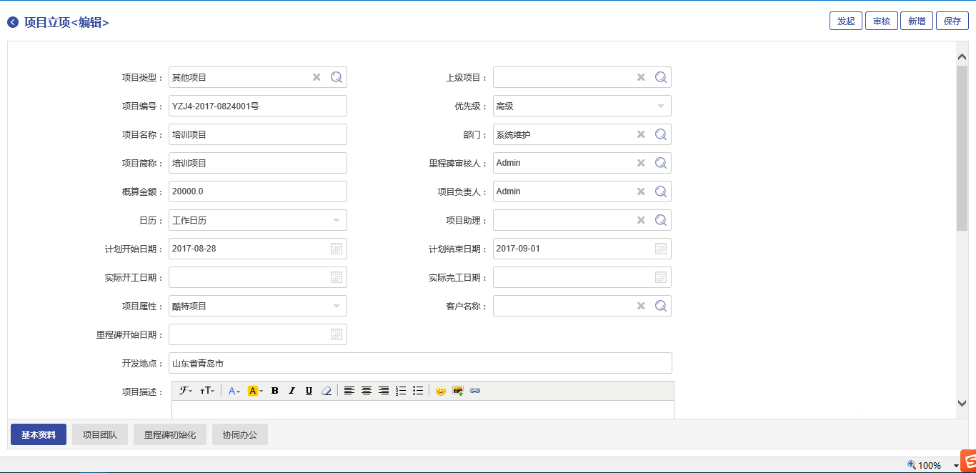 ? 包含項目的創(chuàng)建及審批,創(chuàng)建項目時除填寫相關信息外,還可以上傳相關文檔、定義項目團隊、創(chuàng)建里程碑計劃。