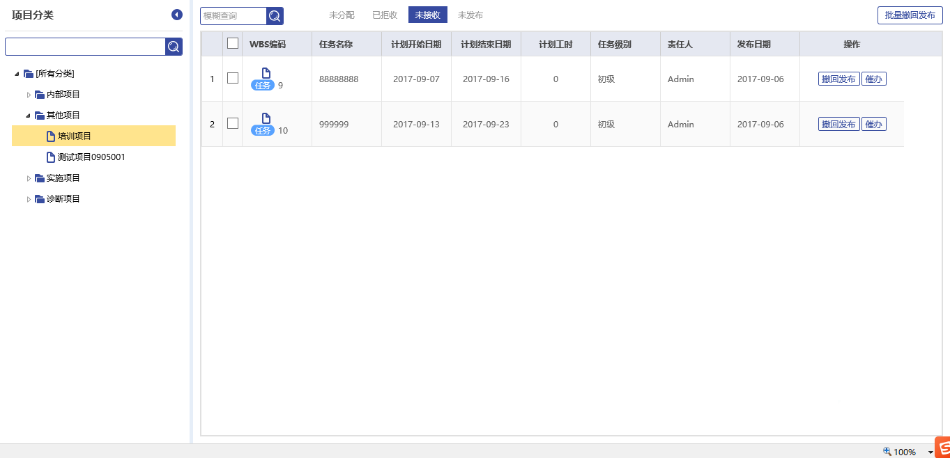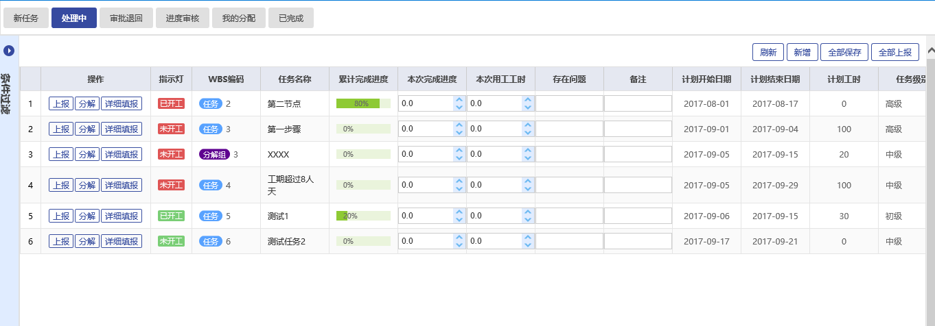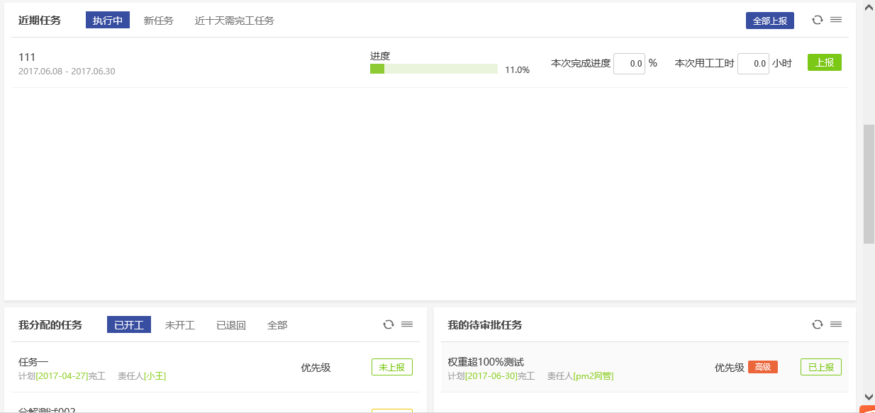 項目創(chuàng)建并通過審批后,就可以進行任務分配了,同一個任務可以分配給一個人或多個人。分配任務時須指定任務計劃開始和結束日期。任務可以是小時,可以是工作日,每個任務的單位可以不一樣,如工時、百分比、個、件等。任務分配時,任務接收人員可以選擇接受,也可以輸入理由后選擇拒絕,提醒管理者重新進行任務分配。任務接收人對于接收的任務,還可以進行下級的任務分配。