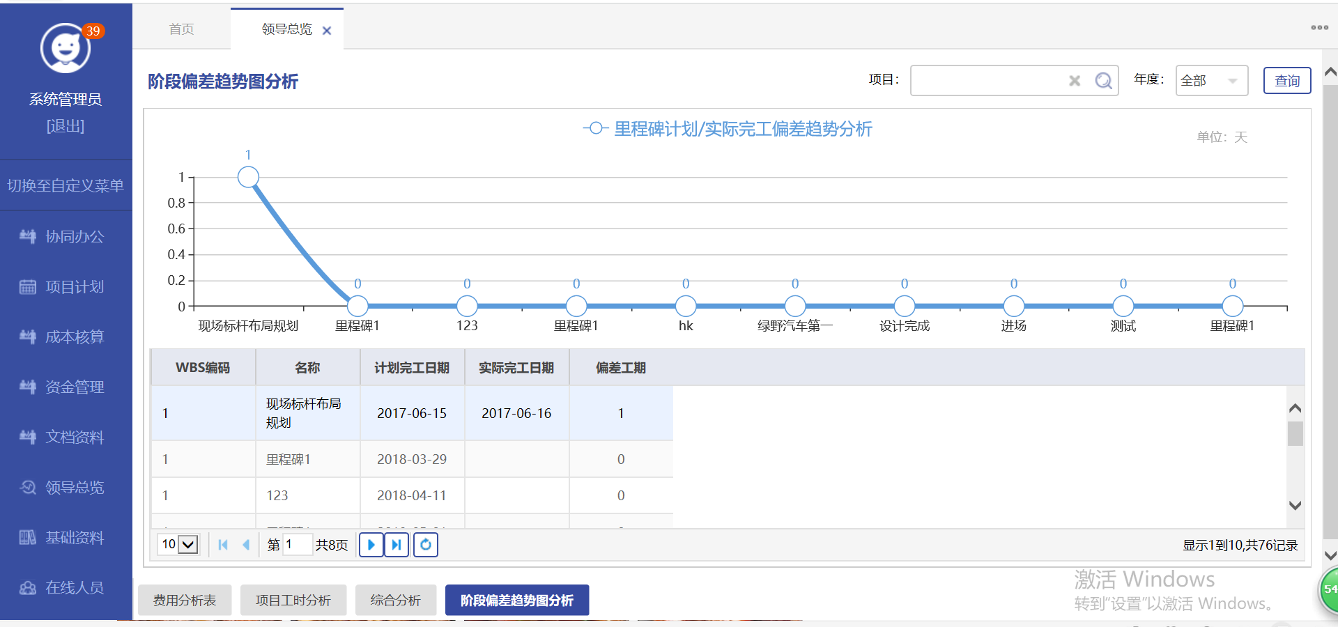 針對系統(tǒng)建設(shè)的計劃管理、進(jìn)度管理等模塊信息,對各項指標(biāo)進(jìn)行綜合統(tǒng)計分析,并結(jié)合各種圖表進(jìn)行綜合展示。以同比、環(huán)比、趨勢等分析方法實(shí)現(xiàn)計劃完成率、預(yù)警信息的統(tǒng)計分析,輔助各級領(lǐng)導(dǎo)決策。