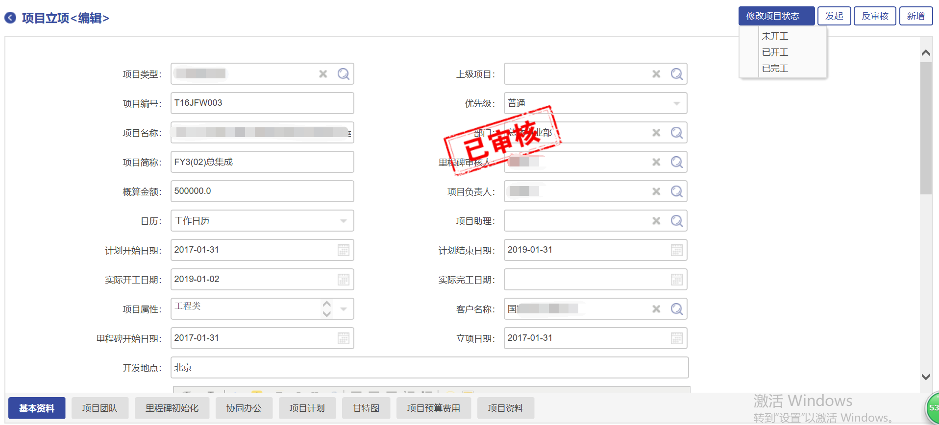 PM2項目管理系統(tǒng)應(yīng)用,完全實(shí)現(xiàn)了只需要點(diǎn)開項目庫,查看項目基本信息、團(tuán)隊信息、里程碑信息、進(jìn)度計劃、項目文件等內(nèi)容。無需分開到其他地方進(jìn)行查詢。項目基本信息如圖所示: