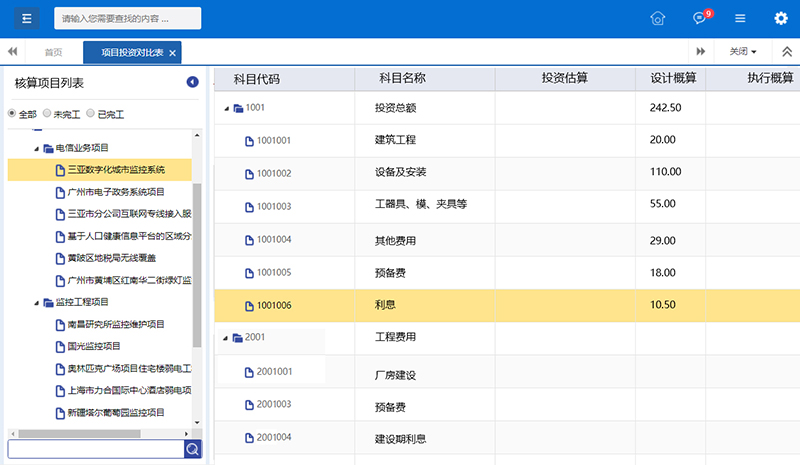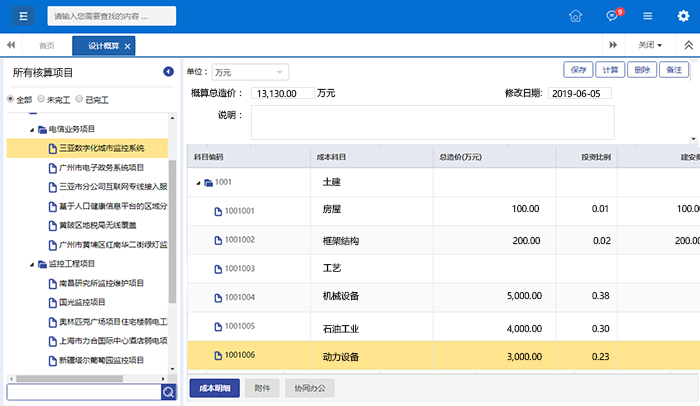 2、靈活的項(xiàng)目核算體系 根據(jù)企業(yè)管理要求和特點(diǎn),自定義多層次的核算項(xiàng)目,支持技改項(xiàng)目、大修項(xiàng)目、基建項(xiàng)目、科技項(xiàng)目、新產(chǎn)品開(kāi)發(fā)等各類項(xiàng)目;成本結(jié)構(gòu)樹(shù)和經(jīng)濟(jì)技術(shù)指標(biāo)靈活定義,并可以按照不同類型的項(xiàng)目保存模版及歷史數(shù)據(jù),新項(xiàng)目時(shí)支持導(dǎo)入經(jīng)驗(yàn)數(shù)據(jù)。 3、嚴(yán)謹(jǐn)?shù)耐顿Y估算與設(shè)計(jì)概算 初步投資估算通過(guò)經(jīng)濟(jì)技術(shù)指標(biāo)、經(jīng)驗(yàn)公式、歷史項(xiàng)目數(shù)據(jù)、項(xiàng)目費(fèi)用構(gòu)成計(jì)算出項(xiàng)目的初步投資額,一般此階段允許的誤差為-10%~~+25%。隨著項(xiàng)目的長(zhǎng)期積累,可以形成豐富的模版。對(duì)于類似項(xiàng)目通過(guò)模版,調(diào)整經(jīng)濟(jì)技術(shù)指標(biāo)及各種參數(shù),即可快速完整的生成項(xiàng)目投資估算。 根據(jù)投資估算和設(shè)計(jì)圖紙將項(xiàng)目的詳細(xì)預(yù)算細(xì)化,生成項(xiàng)目的詳細(xì)預(yù)算,但是由于很多項(xiàng)目是邊設(shè)計(jì)邊施工,所以在過(guò)程中及時(shí)根據(jù)圖紙的變化與設(shè)計(jì)的修改更新預(yù)算,這樣才能對(duì)項(xiàng)目的執(zhí)行達(dá)到控制,考核的目的?梢栽O(shè)定控制報(bào)警的比例,當(dāng)投資實(shí)際執(zhí)行時(shí),系統(tǒng)會(huì)根據(jù)設(shè)定的比例自動(dòng)及時(shí)提醒哪項(xiàng)費(fèi)用達(dá)到預(yù)警比例,方便管理人員及時(shí)控制。