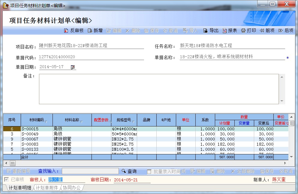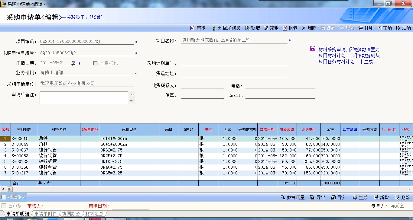 (3)所有項目的材料申請必須通過材料計劃、項目任務(wù)計劃、采購申請單一步一步完成。對項目材料的申請、購買實現(xiàn)全程把控,以下截圖以“隨州光谷鑫城”為例。