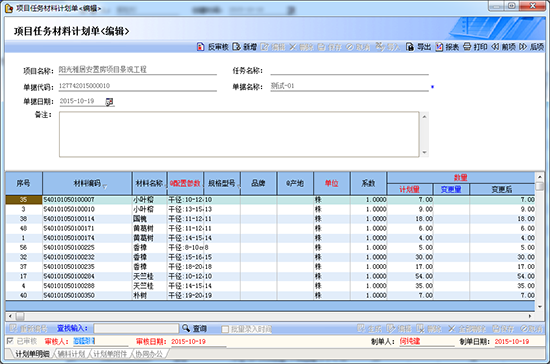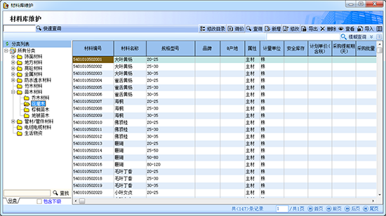 材料主要包括施工過程所需要的各項材料、項目施工現(xiàn)場生活用品以及苗木苗圃。隨時方便查詢某材料設備的供應商和價格,為報價和簽訂合同提供依據(jù)。需要跟蹤材料使用情況,對材料成本使用進行控制。
