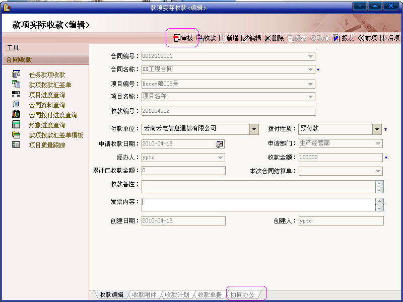 (2)合同管理模塊應(yīng)用:管理本部門牽頭簽署的各種合同及合同的執(zhí)行、款項(xiàng)申請(qǐng)等。