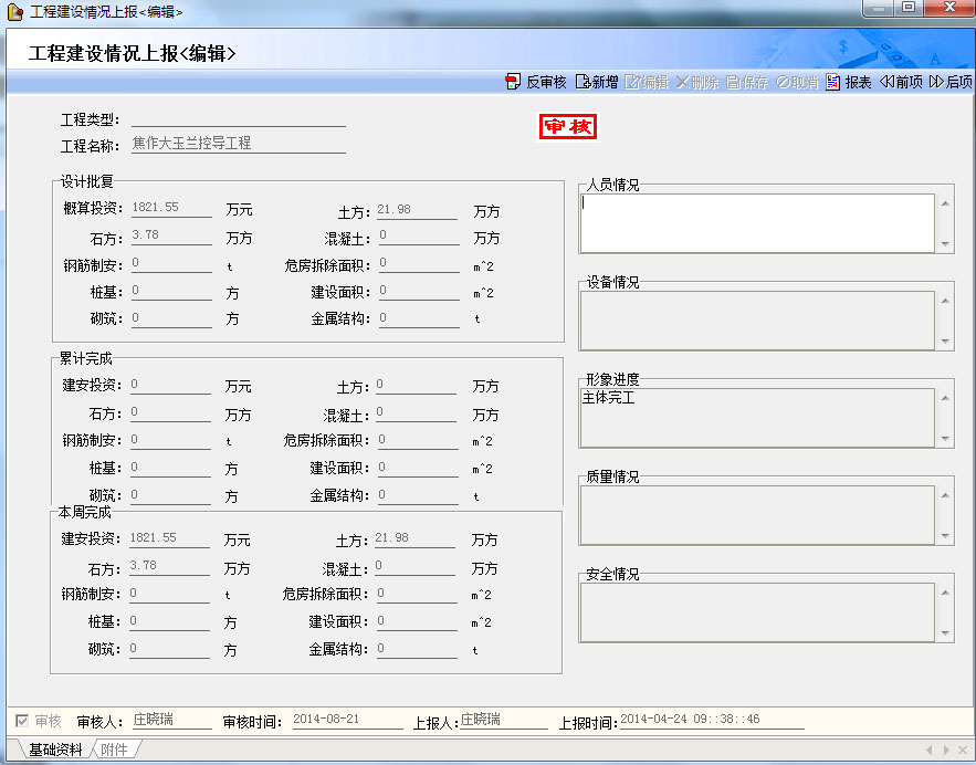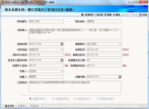 項目信息管理,主要用于項目信息錄入,包括項目編號、項目名稱、項目簡介、項目建管模式、參見單位、批復總投資、招標設(shè)計總投資、批復建設(shè)總工期、批復開建時間、批復永久用地、批復臨時用地等信息及項目級數(shù)據(jù)權(quán)限管理。