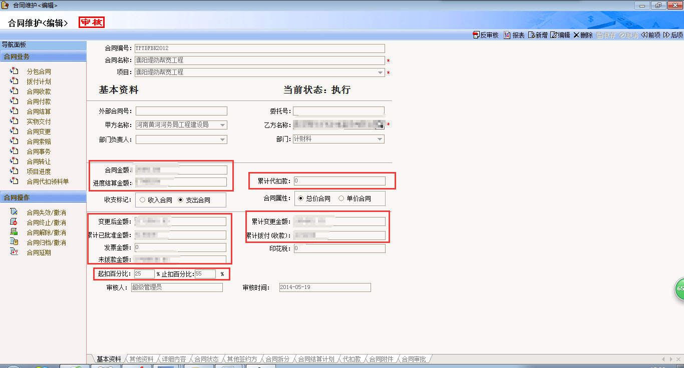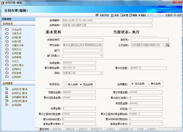 合同管理是整個系統(tǒng)的核心。通過合同模版、擬訂合同、合同登記、合同撥款、合同變更、合同結(jié)算等功能實現(xiàn)合同業(yè)務(wù)的全面管理,十幾種合同報表從不同的角度和層次,動態(tài)反映合同執(zhí)行情況。輔助的發(fā)票登記與核銷、關(guān)聯(lián)資金、成本、采購等系統(tǒng),輕松實現(xiàn)施工合同、采購合同等各類合同的綜合管理。