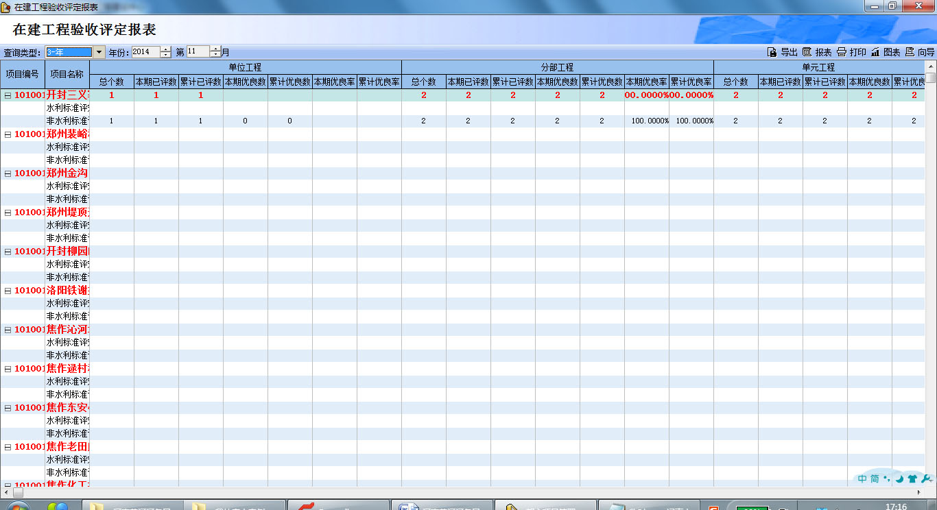 質(zhì)量管理中,主要按照水利行業(yè)質(zhì)量管理要求對項目進行質(zhì)量劃分,包括單位工程劃分、分部工程劃分、單元工程劃分(可以直接通過excel導入)。在質(zhì)量驗收過程中,系統(tǒng)按照分部工程質(zhì)量驗收、單位工程質(zhì)量驗收、項目總體工程質(zhì)量驗收的特點,根據(jù)水利行業(yè)質(zhì)量管理要求,實現(xiàn)質(zhì)量逐級評審匯總功能,并自動生成質(zhì)量驗收評定報表。