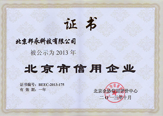 2013年10月,經(jīng)北京企協(xié)信用評(píng)價(jià)中心歷時(shí)2個(gè)多月的全面評(píng)價(jià),并經(jīng)社會(huì)公示程序,邦永科技被北京企協(xié)信用評(píng)價(jià)中心授予“北京市信用企業(yè)”榮譽(yù)稱號(hào)。
