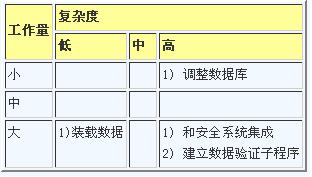 2、使用兩個指標(biāo)來評估每一個任務(wù):復(fù)雜度(分為高、中、低三個檔次)和工作量(分為大、中、小三個檔次)。一個并不復(fù)雜的任務(wù)仍然可能是一個工作量很大的任務(wù)。例如,將paper form上的信息保存在數(shù)據(jù)庫中可能需要數(shù)周的時間。一個非常復(fù)雜的的任務(wù)的工作量也可能不大,但仍然需要花很多時間來完成,例如對一個數(shù)據(jù)庫的性能優(yōu)化。對于復(fù)雜的任務(wù),一般當(dāng)其非常大時,拆分成小的任務(wù)后分配到許多人或團(tuán)隊時是非常困難的。而簡單的任務(wù)就很容易地被分拆和分配。