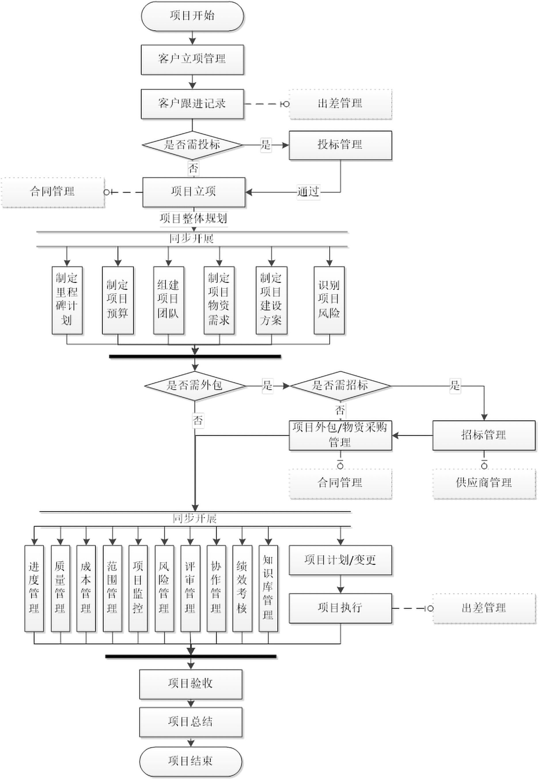 ? 1. 實現(xiàn)外部項目的客戶、售前、投標、合同、立項、整體規(guī)劃、人員外包、設備采購、實施、驗收、維護的全過程管理;