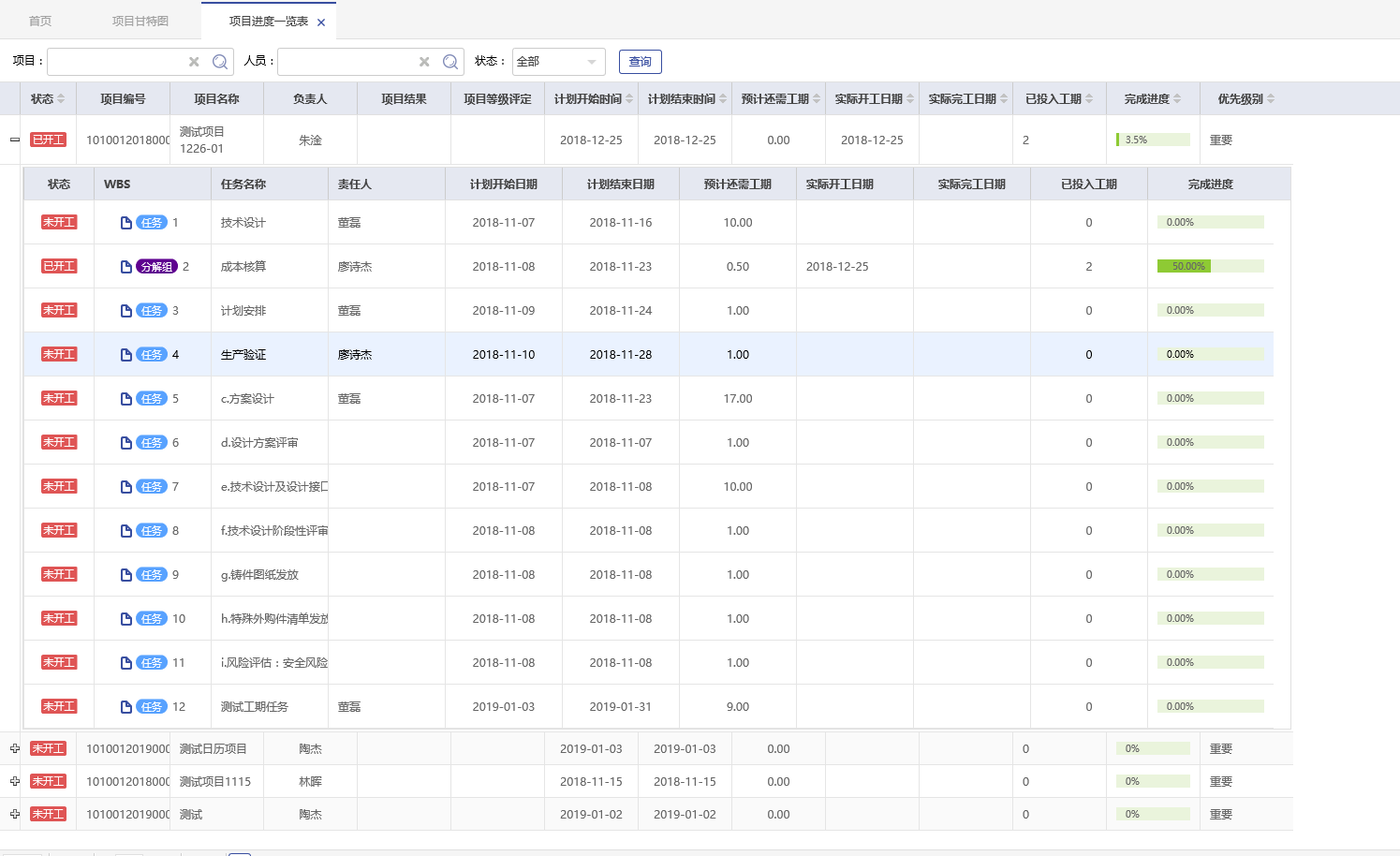 企業(yè)管理層需要了解一個(gè)項(xiàng)目從頭到尾所有的工作計(jì)劃完成時(shí)間,實(shí)際完成時(shí)間,完成進(jìn)度比,相關(guān)責(zé)任人,可以在系統(tǒng)中通過項(xiàng)目進(jìn)度一覽表來了解這些內(nèi)容,在這張報(bào)表中,可以通過對(duì)項(xiàng)目、責(zé)任人以及項(xiàng)目目前的狀態(tài)進(jìn)行篩選查看,每條計(jì)劃的進(jìn)展情況都一目了然。