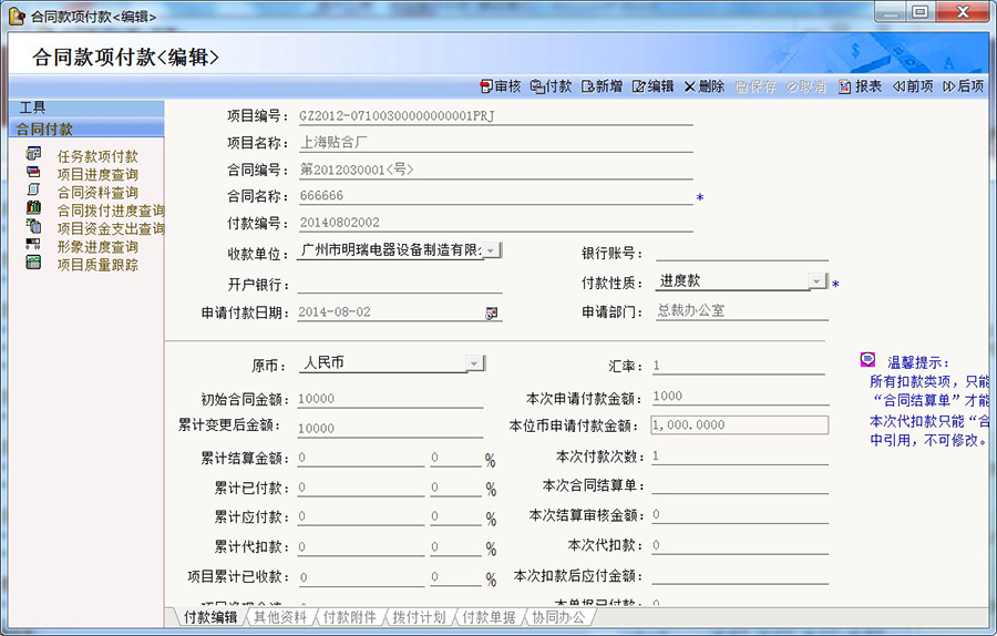 支出合同進度結(jié)算時,軟件按照收入合同收款的情況,提示用戶是否可對支出合同進行付款,同時還會與合同的開票情況做比對,避免款項和發(fā)票的不匹配。