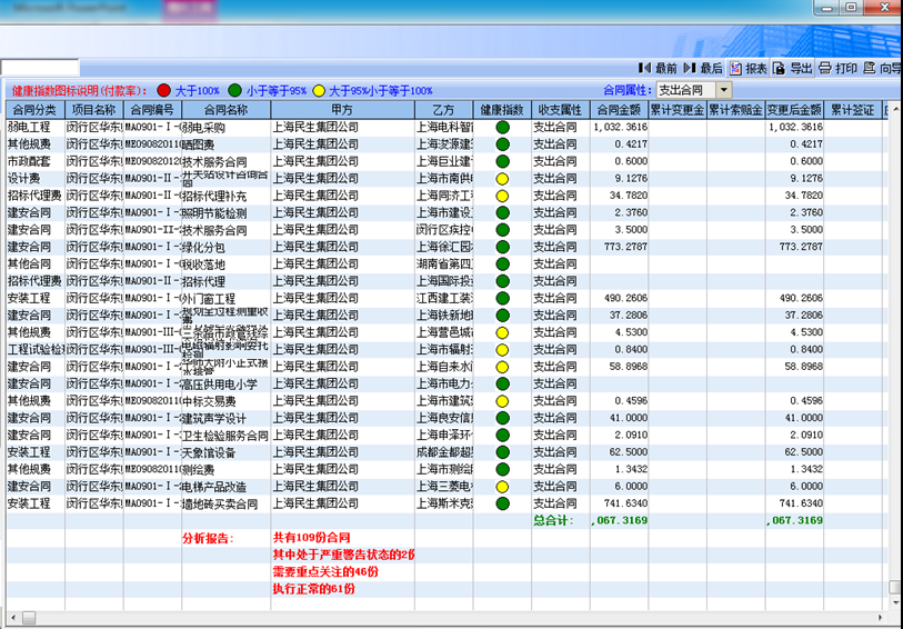 軟件不僅提供了傳統(tǒng)的收入合同、支出合同的統(tǒng)計臺賬,還根據(jù)BI分析的思想,從用戶的角度出發(fā),對關鍵合同數(shù)據(jù)做了對比分析,并以紅綠燈的形式直觀的體現(xiàn)每個合同的執(zhí)行健康狀況。