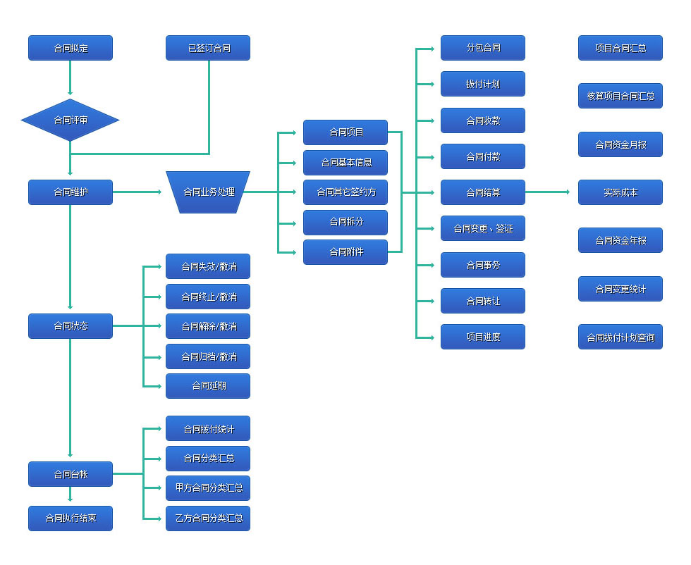 按照項目的生命周期和項目型企業(yè)的管理過程,邦永PM2合同管理軟件對企業(yè)收支合同執(zhí)行“合同簽訂前流程控制,合同執(zhí)行中保證利潤,合同結算時不留隱患,合同維保期及時提醒”的管理策略。在保證每個項目利潤的前提下達到企業(yè)的收支平衡;通過嚴謹而個性化的合同管理流程,達到對每個合同管理環(huán)節(jié)的過程監(jiān)管,以便有效的降低合同管理過程中的人為錯誤,整體上提高企業(yè)的合同管理水平。