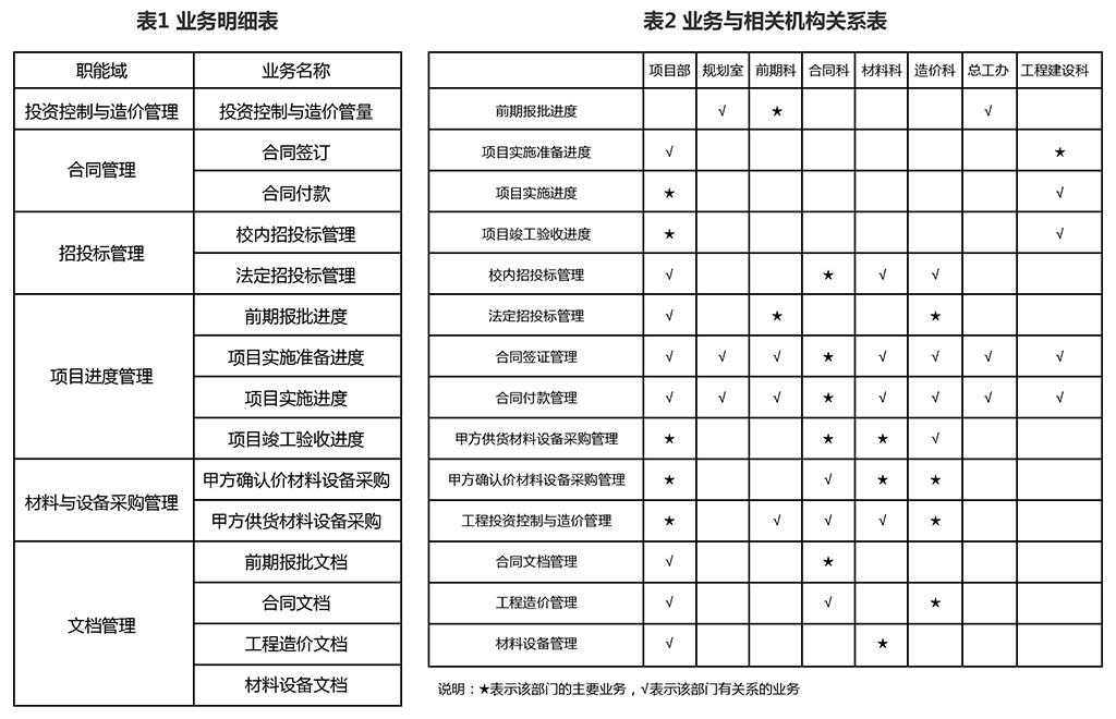 組織職能是為實(shí)現(xiàn)組織的管理目標(biāo),被賦予的職責(zé)和功能。一個職能域描述組織某一方面的職能。通過職能域的劃分,可以有效地將不同職能進(jìn)行優(yōu)化組合。清華大學(xué)基建管理部門的工作分為六個職能域,分別是:投資控制與造價管理、合同管理、招投標(biāo)管理、材料與設(shè)備管理、項目進(jìn)度管理、信息傳遞與文檔管理。確定職能域后,可通過對職能域中所含業(yè)務(wù)及其流程進(jìn)一步研究,更加詳細(xì)地了解組織中存在的問題。