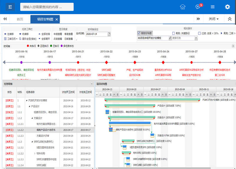 9、智能預(yù)警機(jī)制 合同變更、簽證預(yù)警、成本目標(biāo)超支預(yù)警、超合同付款預(yù)警、當(dāng)前工作提醒、工程進(jìn)度滯后預(yù)警等多種預(yù)警機(jī)制,主動(dòng)為您把握關(guān)鍵業(yè)務(wù)環(huán)節(jié),將被動(dòng)工作演繹為主動(dòng)。 10、多項(xiàng)目、多層次進(jìn)度計(jì)劃 支持外部項(xiàng)目,實(shí)現(xiàn)項(xiàng)目/子項(xiàng)目無(wú)限分解;支持任務(wù)分組。甘特圖、網(wǎng)絡(luò)圖(單代號(hào)、雙代號(hào))、工作日歷、邏輯圖等多種工具從不同側(cè)面展現(xiàn)項(xiàng)目進(jìn)度與計(jì)劃,關(guān)鍵路徑自動(dòng)計(jì)算;用戶自定義圖形顯示方式。項(xiàng)目模版形成企業(yè)的標(biāo)準(zhǔn)項(xiàng)目流程。