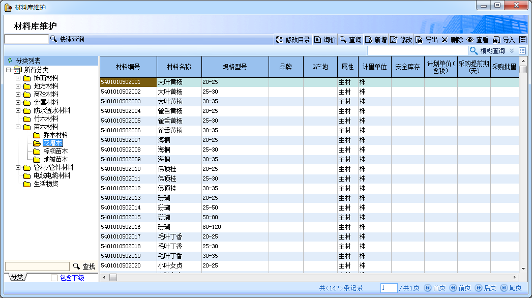 材料主要包括施工過程所需要的各項材料、項目施工現(xiàn)場生活用品以及苗木苗圃。隨時方便查詢某材料設備的供應商和價格,為報價和簽訂合同提供依據(jù)。需要跟蹤材料使用情況,對材料成本使用進行控制。