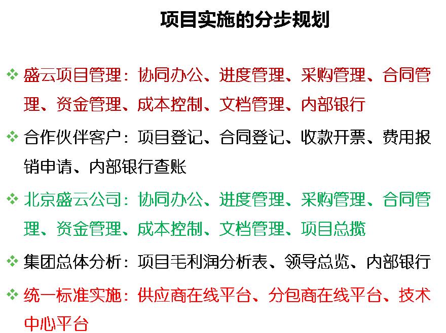 2014年12月盛云科技有限公司經(jīng)過多方審慎評(píng)估,最終選擇邦永科技PM2項(xiàng)目管理軟件(V8.0)為公司信息化管理平臺(tái),核心業(yè)務(wù)為弱電、消防與系統(tǒng)集成工程總承包核心業(yè)務(wù)模塊,滿足核心業(yè)務(wù)的管理控制需要,實(shí)現(xiàn)各項(xiàng)目業(yè)務(wù)網(wǎng)絡(luò)化管理。包括:協(xié)同辦公、項(xiàng)目計(jì)劃、物資管理、合同管理、資金管理、成本管理、質(zhì)量管理、安全管理、竣工管理、內(nèi)部銀行、人力資源、文檔管理、自定義表單、維保管理、基礎(chǔ)資料等系統(tǒng)模塊;