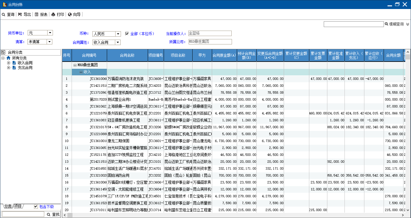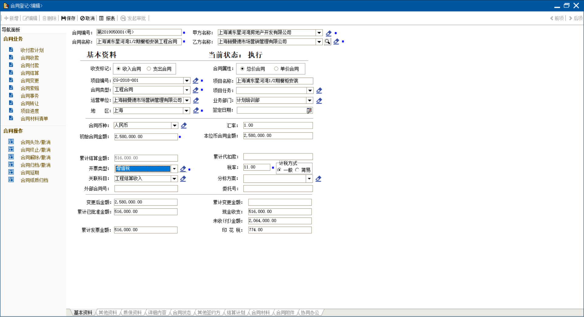 實現(xiàn)對收入合同、支出合同進行分類管理,涉及合同簽定、合同變更、收款計劃、付款計劃、開票、收付款、結(jié)算等各類業(yè)務(wù)。實現(xiàn)能夠結(jié)構(gòu)化的管理,方便統(tǒng)計分析和查詢。