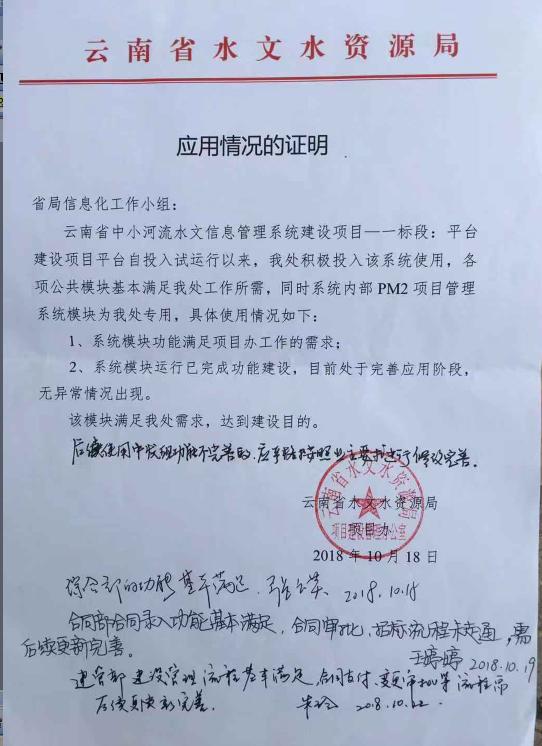 2018年10月18日經(jīng)過邦永科技昆明分公司現(xiàn)場實施工程師以及邦永總部開發(fā)部的不斷努力,完成項目的全部實施內(nèi)容,獲得客戶對我們的工作一致認可,最終代表項目辦的綜合部及其他職能部門在所提交的驗收報告上簽字確認,并出具了“應(yīng)用情況證明”。為此,云南省水文水資源局PM2項目管理系統(tǒng)圓滿完成。