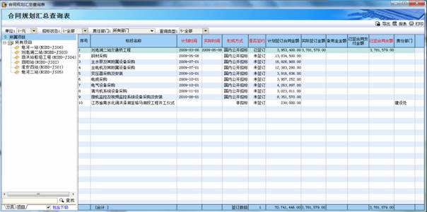 系統(tǒng)根據(jù)合同規(guī)劃管理要求,自動產(chǎn)生了合同規(guī)劃報表、招標計劃、非招標合同計劃、合同臺帳、備用金臺帳、合同變更臺帳、索賠臺帳等,滿足多方位查詢、分析。