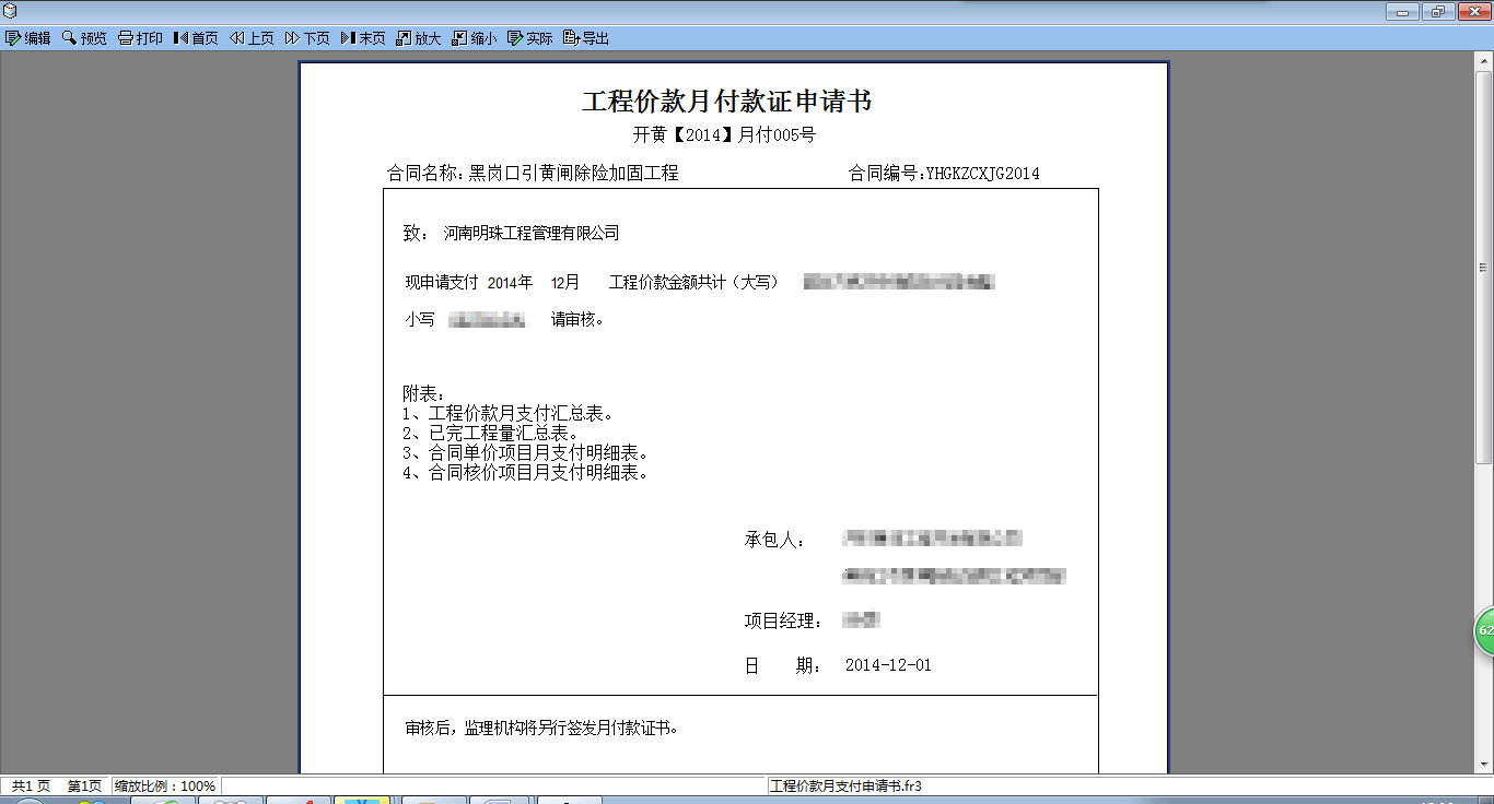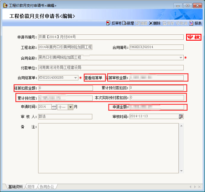 工程價款月支付申請管理,支持預付款自動扣回。