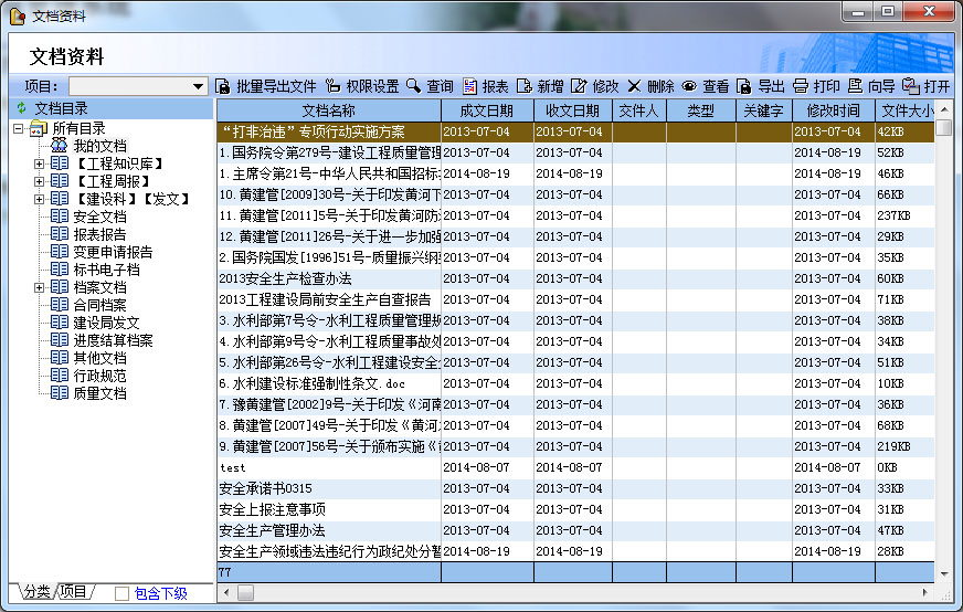 文檔資料的整理與歸檔是項目管理過程中一項重要的工作,建設(shè)工程資料記載了建設(shè)工程活動全過程的重要內(nèi)容,它是企業(yè)檔案的重要組成部分,也是工程建設(shè)過程的指導文件,又是對工程進行檢查、驗收、移交、使用、管理、維修、改建和擴建的原始依據(jù)。通過文檔管理子系統(tǒng)的上線,使得建設(shè)局的文檔分類、文檔權(quán)限設(shè)置更加嚴密、查詢也更加便捷,且有詳細的使用記錄。