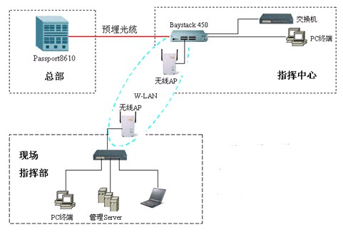 公司總部與指揮中心(籌建處)之間是通過光纜連接;I建處與現(xiàn)場指揮部通過無線網(wǎng)絡(luò)橋接 AP,在 AP 上加設(shè)專用的避雷系統(tǒng),再將 AP 與各自的交換機(jī)進(jìn)行連接,這樣,兩個網(wǎng)絡(luò)的用戶即可通過這條無線的通道進(jìn)行安全的連接。項(xiàng)目現(xiàn)場又包括項(xiàng)目指揮部、電建二公司、電建三公司和監(jiān)理公司三個子網(wǎng)。遠(yuǎn)程用戶通過VPN連接。數(shù)據(jù)庫服務(wù)器、代理服務(wù)器、應(yīng)用服務(wù)器均設(shè)置在現(xiàn)場指揮部機(jī)房管理,又甲方網(wǎng)絡(luò)管理員負(fù)責(zé)維護(hù)。
